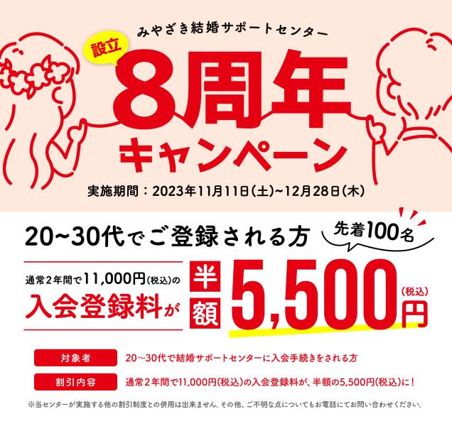 本センター設立8周年を記念して、11月11日のいい出会いの日から12月28日まで、新規入会登録される20~30代の独身男女(先着100名)を対象に、2年間で11,000円(税込)の入会登録料が半額の5,500円(税込)となるキャンペーンを実施します!!