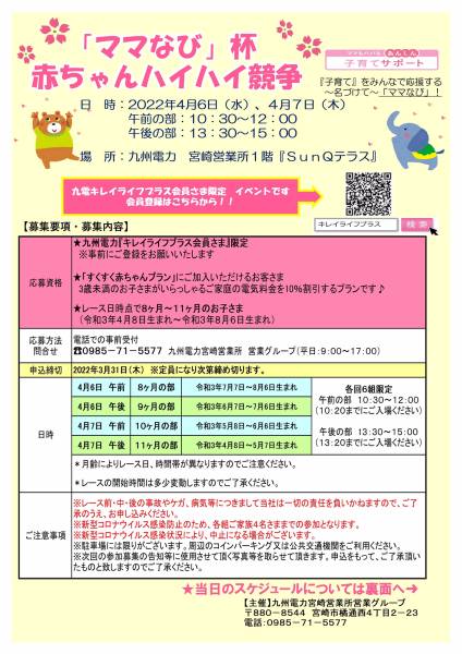 - 4月6日(水)、4月7日(木)の2日間、九州電力宮崎営業所にて、赤ちゃんハイハイ競争を開催!