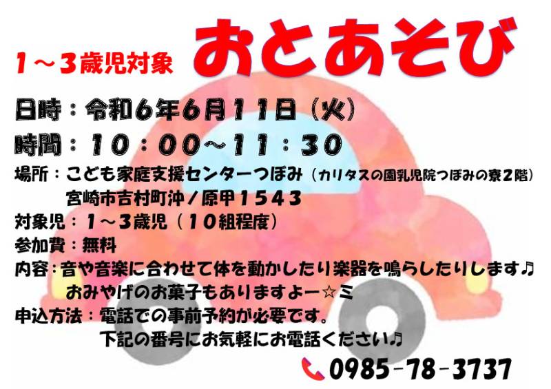 <内容>音や音楽に合わせながら体を動かして遊んだり楽器を鳴らしたり読み聞かせをしたりします。おとあそび終了後にはお菓子のおみやげもありますのでお気軽にご参加ください。見学のみでもOKです!楽しい時間を過ごしましょう♪