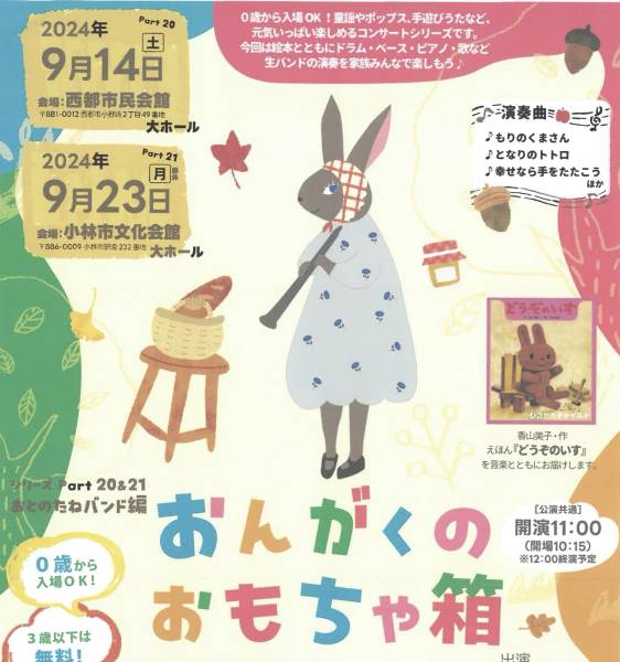 - 0歳から入場OK!童謡やポップス、手遊びうたなど、元気いっぱい楽しめるコンサートシリーズです。今回は絵本とともにドラム・ベース・ピアノ・歌など生バンドの演奏を家族みんなで楽しもう♪