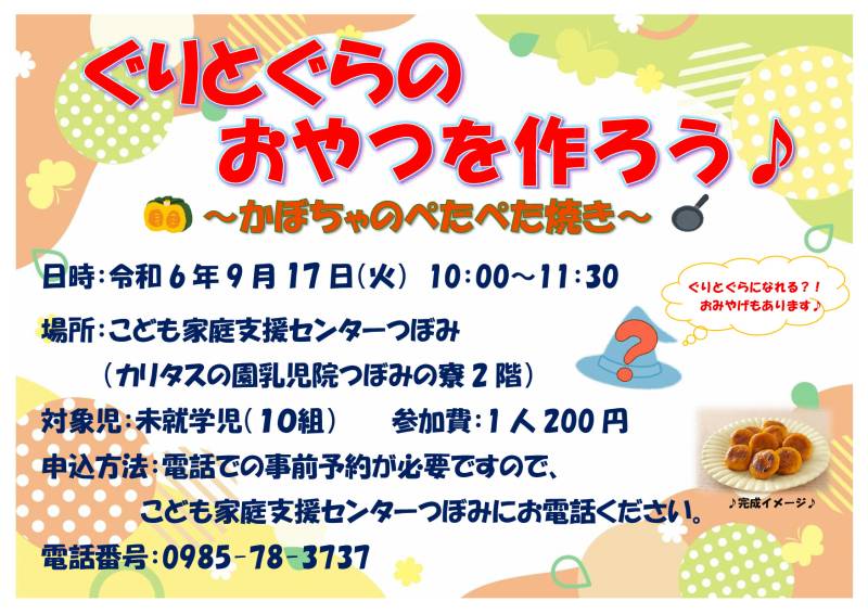 ぐりとぐらの絵本にでてくるおやつ、かぼちゃのぺたぺた焼きを作ります。9月にぴったりな製作も行いますので、思い出作りにぜひお気軽にご参加ください。