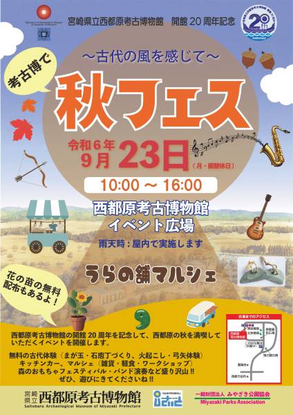 - 西都原考古博物館の開館20周年を記念して開催されます。無料の古代体験(まが玉、石包丁づくり、火起こし、弓矢体験)のほか、キッチンカーやマルシェが出店します。森のおもちゃフェスティバル、バンド演奏などもりだくさん。西都原の秋が満喫できます。