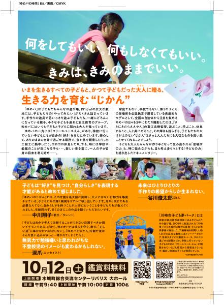 - 家庭でも学校でもない第3の子どもの居場所としての「ゆめパーク」。そこではどんな遊びでも自由にでき、地域の大人たちやボランティアとの交流を通じて、子どもたちが学ぶ姿があります。子育て中の親御さん、子どもに関わるお仕事をされている方々、そしてもちろん子どもたちにぜひ見ていただきたい映画です。入場料は無料です!ぜひご来場ください。