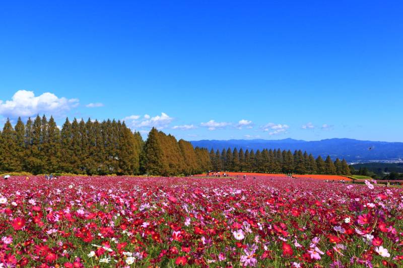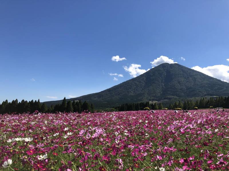 赤や白、ピンク色の花を咲かせる約100万本のコスモスが色鮮やかに高原を彩ります。雄大な霧島連山を背景に、天高い秋晴れの青空とコスモスのコラボレーションが見事で、絶好のフォトスポットとして知られています。