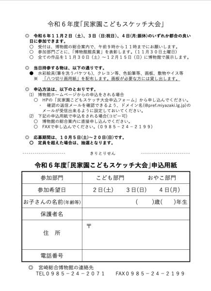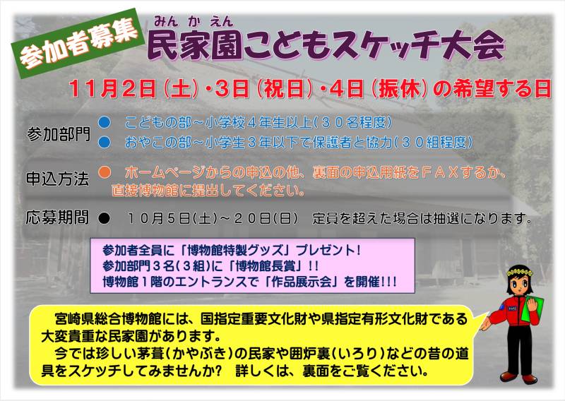 宮崎県総合博物館には、国指定重要文化財や県指定有形文化財である大変貴重な民家園があります。今では珍しい茅葺(かやぶき)の民家や囲炉裏(いろり)などの昔の道具をスケッチしてみませんか?