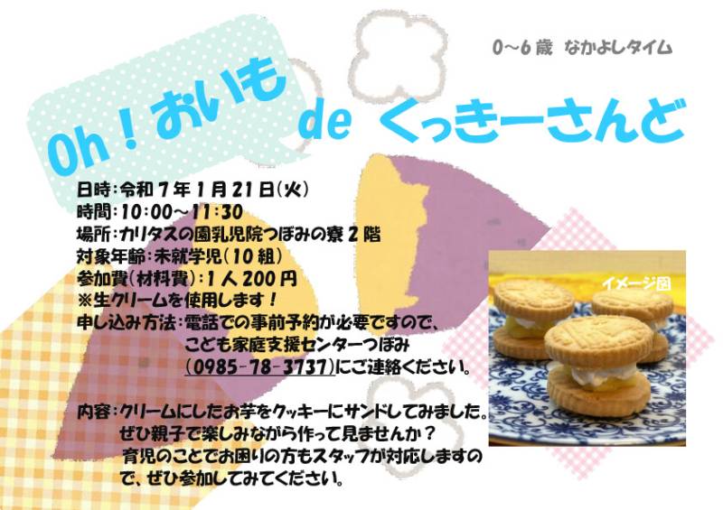 内容:クリームにしたお芋をクッキーにサンドしてみました。ぜひ親子で楽しみながら作って見ませんか? ※生クリームを使用します!