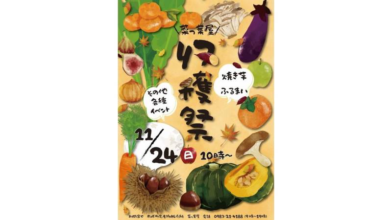 農産物の特価販売、焼き芋のふるまいなどお得で楽しい内容盛りだくさんでお待ちしております。