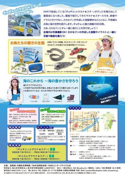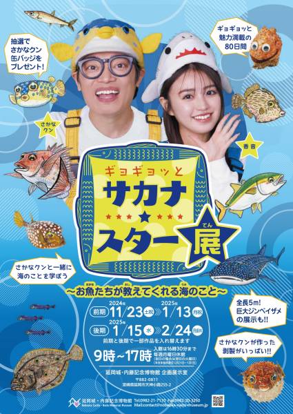 - NHKで放送している「ギョギョッとサカナ★スター」がテレビを飛び出して展覧会になりました。番組で紹介してきたサカナ★スターたちを、映像やイラストだけでなく、さかなクンが作成したはく製などとともに、不思議なお魚の世界を紹介し、お魚たちを通して海の今を伝えていきます。ロビーには全長5mの巨大ジンベイザメのはく製も展示。特別展内の展示物は撮影Okです。さかなクンの作成したはく製やイラストと写真や動画を撮影することができます。