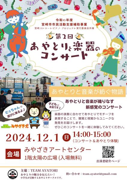 - 楽器の演奏に合わせてあやとりのパフォーマンスを披露。幼児から中学生の子どもたちが出演し、あやとりパフォーマンスと楽器の演奏で作り上げるコンサートです。演奏される曲の世界観に合わせてあやとりの多種な技を楽しめます。
