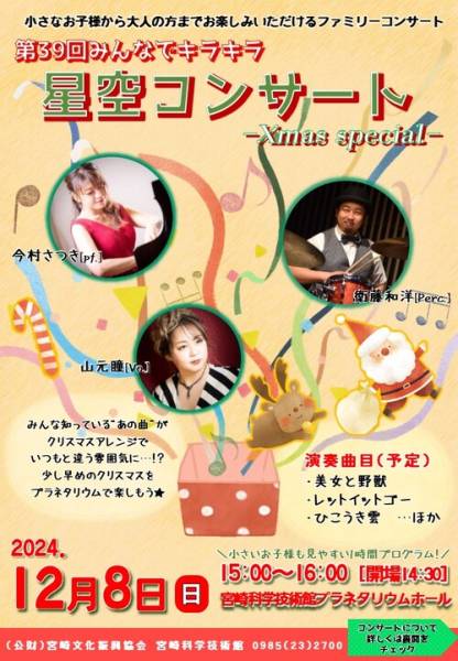 - 小さなお子さまから大人まで楽しめるファミリーコンサートです。みんなが知っている“あの曲”がクリスマスアレンジで演奏されます。いつもと違う雰囲気を楽しみませんか。少し早めのクリスマスをプラネタリウムで満喫できます♫