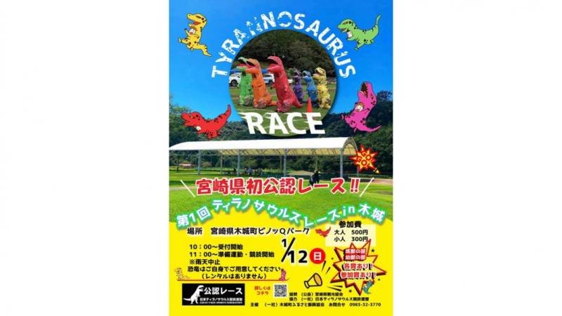 - 日本ティラノサウルス競技連盟の公認レースとして宮崎県では初開催となる「第1回ティラノサウルスレースin木城」を巨大トランポリンやミニ四駆で人気の木城町ピノッQパークで開催いたします!ティラノサウルス以外でのご参加も大歓迎!(公式タイムとしては記録できませんが他の競技に参加できます)参加賞、各部門賞などもご用意して皆様のご参加をお待ちしております!