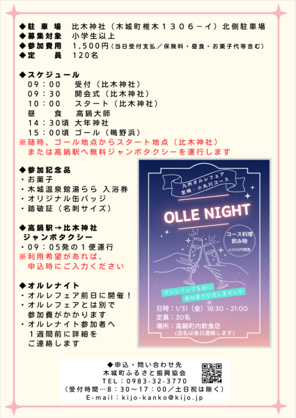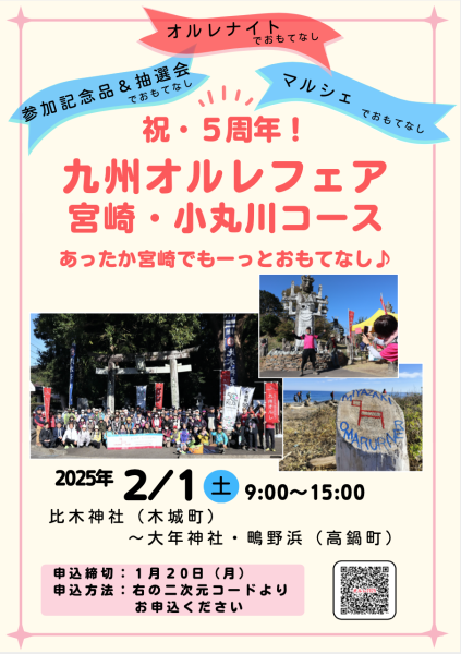 - 今年で5周年を迎える毎回大好評のオルレフェア!コースリーダーが一緒に歩き、参加記念品や抽選会、コース途中では木城町・高鍋町のグルメが味わえるなどたくさんのあったかいおもてなしで、みなさまのご参加をお待ちしております。