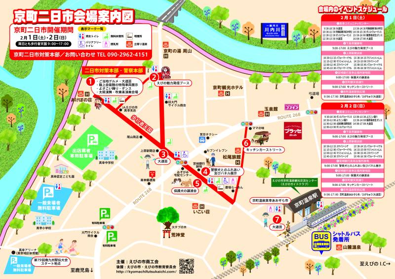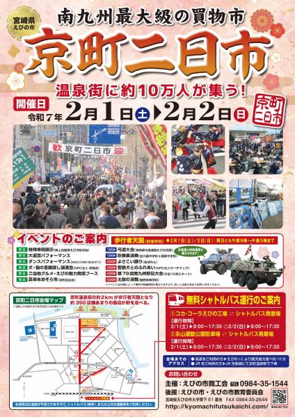 - JR京町温泉駅前で毎年2月の第1土・日に開催される「京町二日市」。100年以上の歴史を持ち、南九州一を誇る規模の買物市です。会場となる温泉街中心部の約2kmが歩行者天国となり、とても賑わいます。