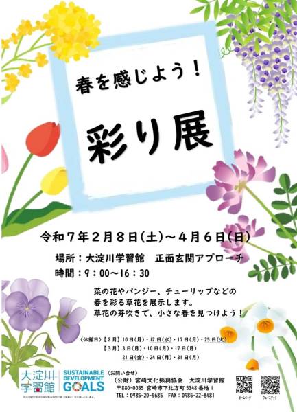 大淀川学習館では、菜の花やパンジー、チューリップなどの春を彩る草花を展示しています。
