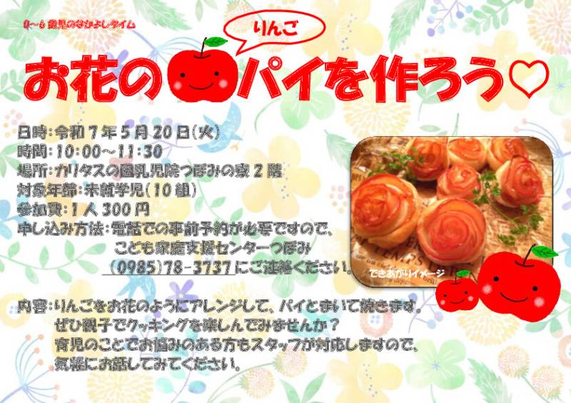 今回は、りんごを薄ーく切って花びらに見立ててりんごのパイを作ります。料理に興味のあるお子さんと一緒に参加してみませんか?