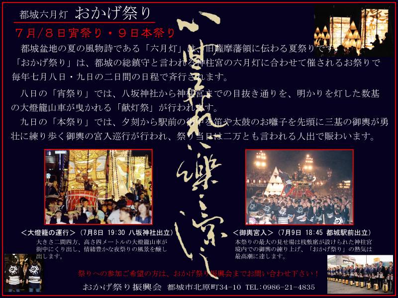 - 毎年七月八日、九日に宮崎県都城市の中心部にある神柱宮を主会場に斉行される都城六月灯「おかげ祭り」